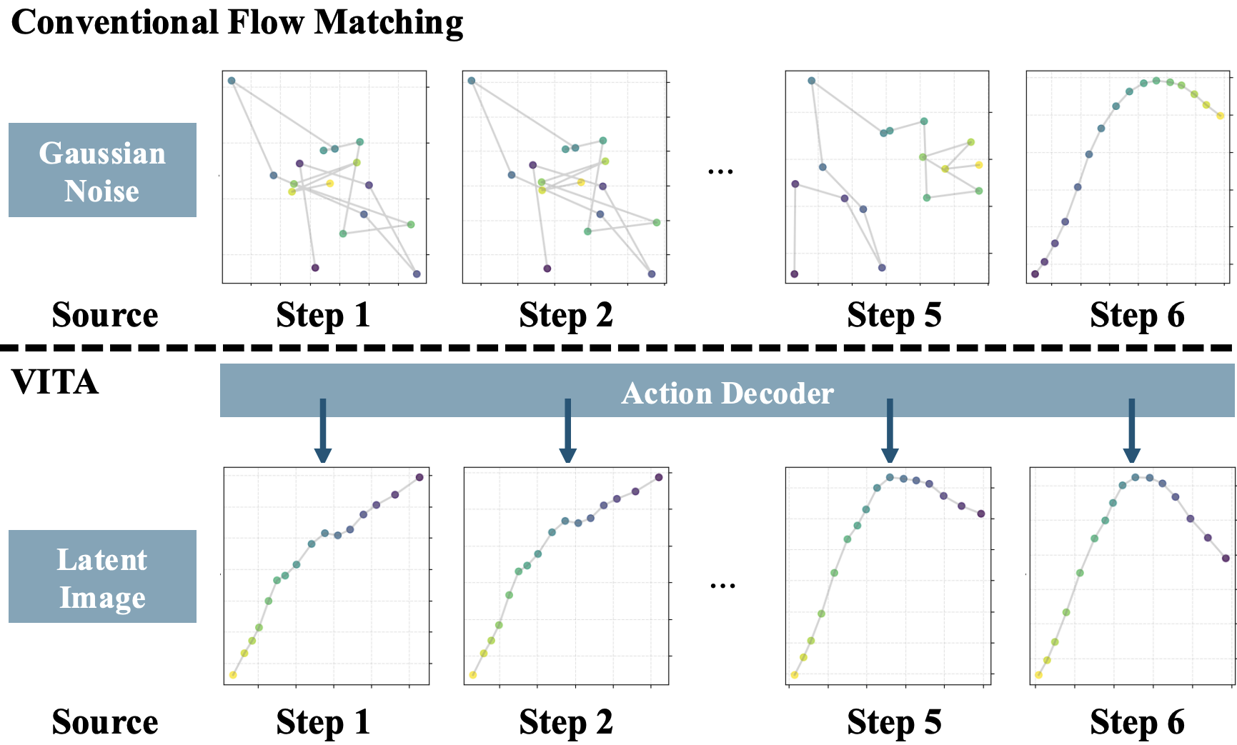 Comparison of the denoising process between conventional flow matching and VITA. Conventional flow matching denoises random Gaussian into actions, VITA flows from latent images to latent actions, and generated actions at initial steps are more structured.
