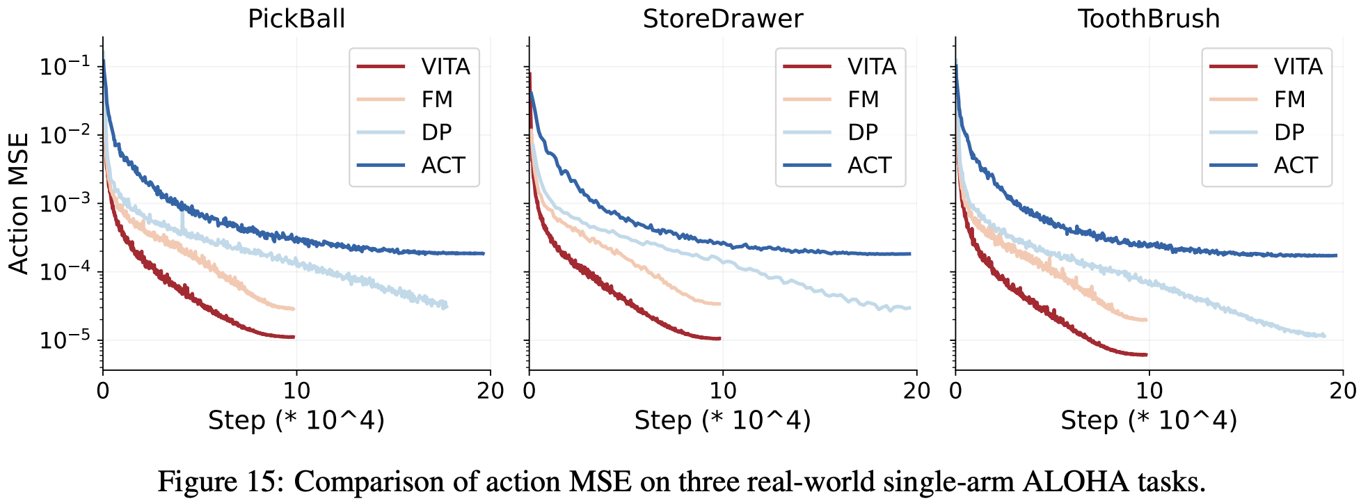 We evaluate VITA on challenging bi-manual manipulation tasks, and single-arm tasks including 9 simulation and 5 real-world tasks on ALOHA, AV-ALOHA, Robomimic, covering bimnual and single-arm manipulation tasks. The MLP-only VITA consistently outperforms or matches state-of-the-art policies (including transformer-based conventional flow matching policy), while being significantly more efficient.